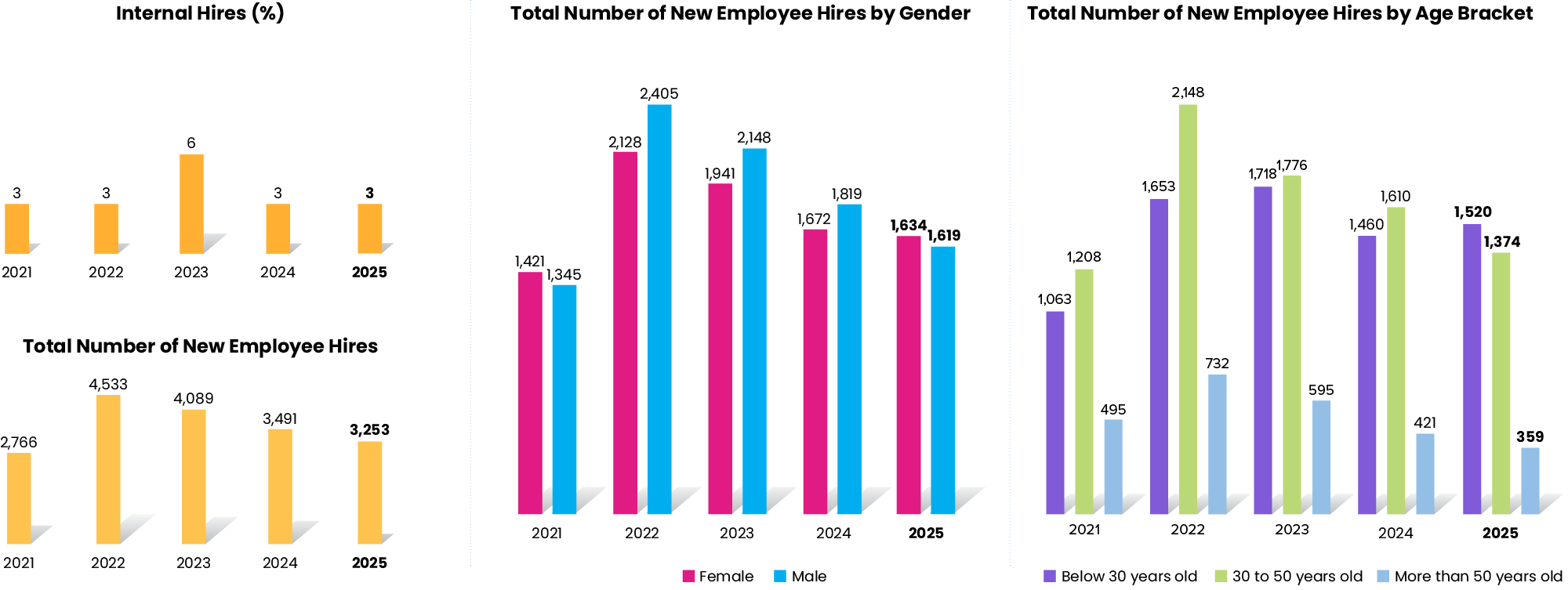 Globally, the Group had 3,253 new hires in 2025. 3.0% of open positions were filled by internal candidates (internal hires).