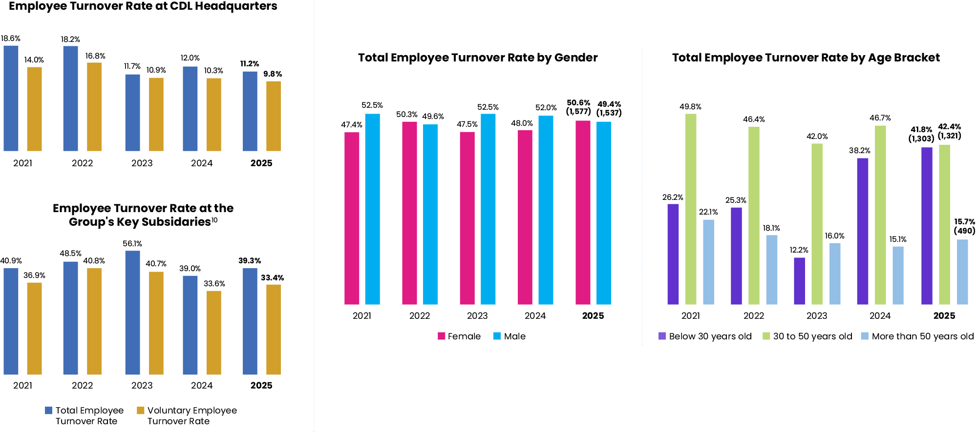 In 2025, the total turnover rate at CDL Corporate Office is 11.2%. At our key subsidiaries, M&C Hotels and CBM Pte Ltd, the total turnover rates are 47.4% and 25.2% respectively.
