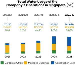 The Company monitors water consumption monthly and annually to detect any anomalies in water usage that may require attention and identify buildings that could be heavy water consumers. To reduce reliance on potable water, the Company uses NEWater from Singapore for our operations, where possible.
