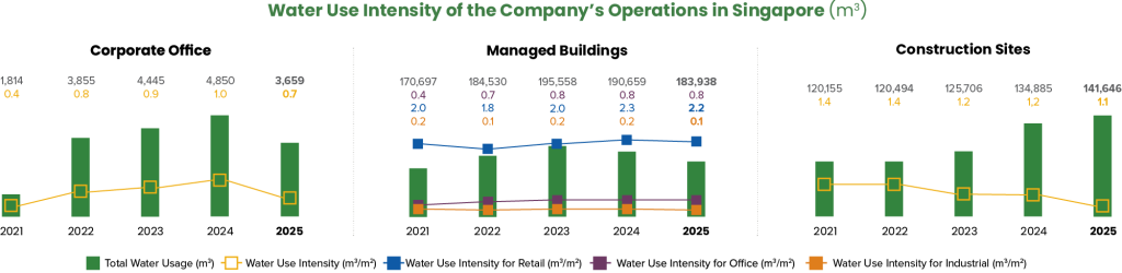 Water intensity for our corporate office and construction sites saw a slight decrease in 2025, due to the increase in floor area under construction. We continue to actively work towards optimising water use. For our managed buildings, we are encouraged to report a modest reduction in water use intensity compared to 2024, demonstrating our ongoing commitment to improving water efficiency.