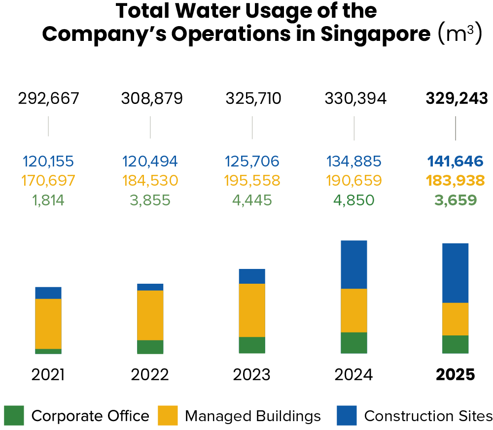 Effective water management is critical to our operations, which are water-intensive and reliant on a stable supply. We take a holistic approach to enhance the efficiency, resilience and value of our assets through sound water management practices, ensuring reliable supply and cost savings for homeowners and tenants. Within our managed buildings, the Company draws both potable and NEWater (for non-potable use) from PUB’s utility network, for building operations and maintenance activities. For commercial buildings, water is utilised for cooling towers, toilets, pantries, water features, irrigation and washing activities. At our construction sites, potable water is used mostly by our contractors for sanitation purposes.