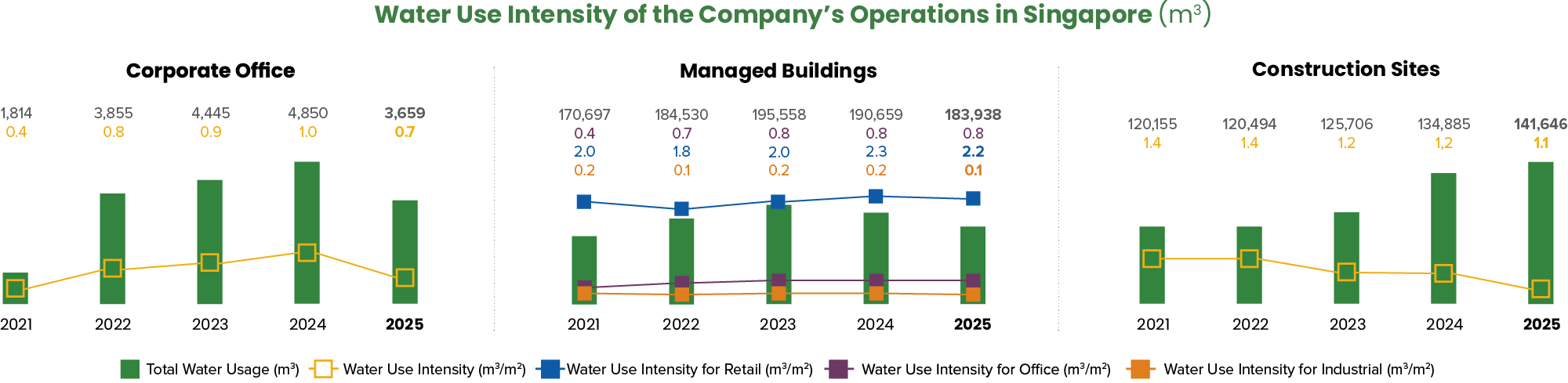 Water intensity for our corporate office and construction sites saw a slight decrease in 2025, due to the increase in floor area under construction. We continue to actively work towards optimising water use. For our managed buildings, we are encouraged to report a modest reduction in water use intensity compared to 2024, demonstrating our ongoing commitment to improving water efficiency.