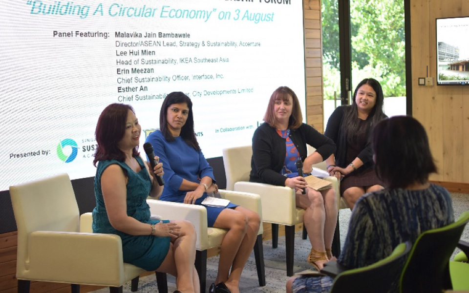 CDL, in collaboration with Interface, held its first Sustainability Thought-Leadership Forum on Building a Circular Economy at the Academy. At the session, Malavika Jain Bambawale, Director/ASEAN Lead, Strategy and Sustainability, Accenture, shared about the five circular economy business models, showing examples of businesses that have successfully adopted them. The presentation was followed by an engaging panel discussion featuring Erin Meezan, Chief Sustainability Officer, Interface; Lee Hui Mien, Head of Sustainability, IKEA Southeast Asia and Malavika Jain Bambawale, and moderated by Esther An, Chief Sustainability Officer, City Developments Limited. They discussed how businesses can create business value by shifting away from the linear model, while making the circular economy attractive to consumers and investors.