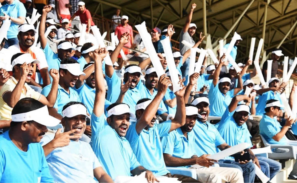 Workers from Kajima Overseas Asia cheering on their teammates from the stands of Yishun Stadium.